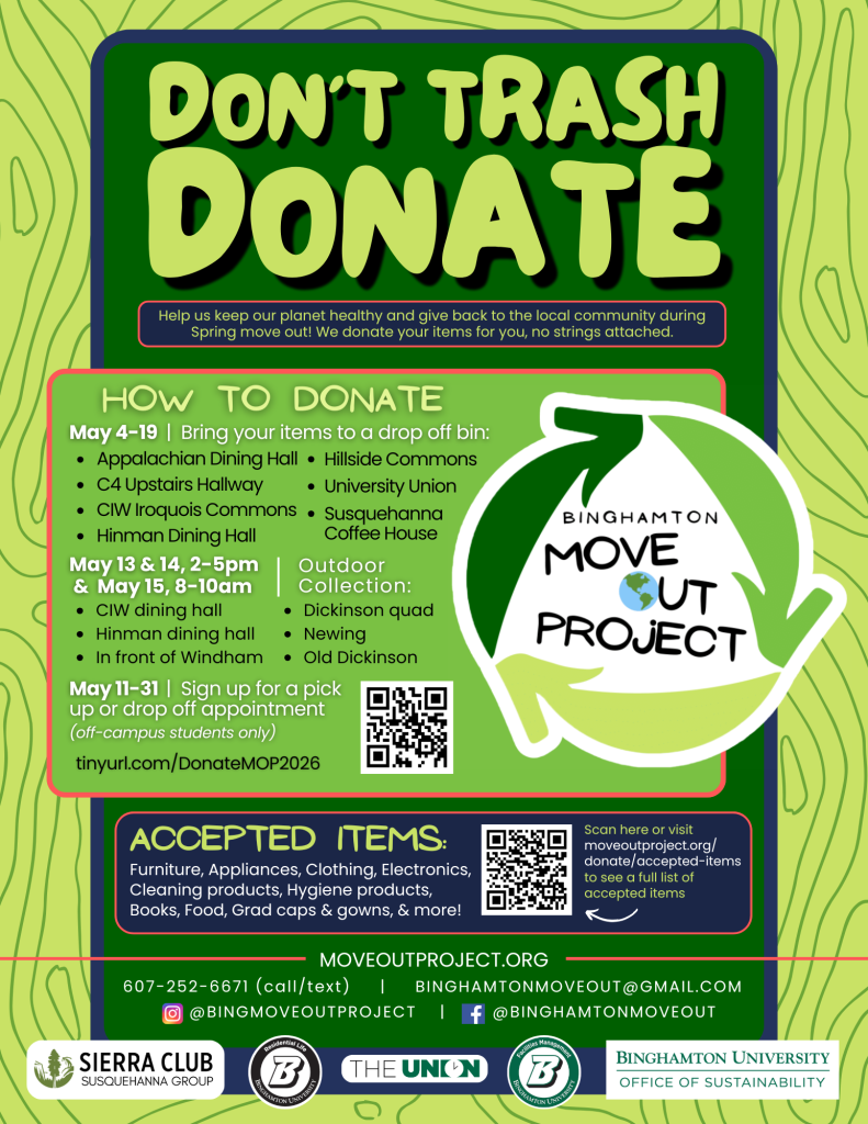 Maybe you live far away from Binghamton and have to consolidate all of your items into a singular vehicle when you move out. Maybe you have accumulated stuff while in college that you no longer have a use for. Maybe you got stuck with items your roommate left behind when they moved out earlier than you. No matter the reason you’re deciding to donate, we appreciate your desire to keep these items out of the landfill and donate them back into the community. We know that the end of the semester can be stressful, which is why the MOP team is here to help you find your items a good home in the most convenient way for you.